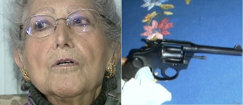 Dona Odete tem artrite nas mãos e disse que nunca tinha atirado antes. A polícia apreendeu um revólver calibre 32.
